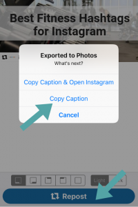 - Select the post you just copied, then click ‘Repost’ at the bottom of the screen. It will bring you to this pop-up. Select ‘Copy Caption.’ If you run multiple Instagram accounts, make sure you’re logged into the correct one before posting!